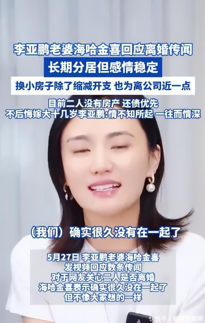此月海哈金喜曾针对网上的“离婚传闻”发视频解释,说两人很久没同框是因为各自忙事业:李亚鹏从春节后就“上山下乡”,帮网友找好茶叶;自己去年底开了工作室,每天要处理一堆杂事。当时她还说“没出问题,也没离婚”,搬小房子是为离公司近、降成本,“我们的情况大家都清楚,积极面对困难,先还债”。